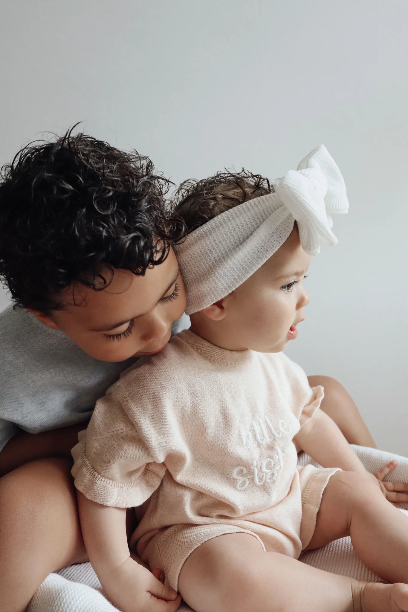 Ideal for pregnancy announcements or celebrating the arrival of a new sibling, this soft, premium cotton playsuit is delicately embroidered with Little Sister, creating a timeless, heirloom-style piece. Pair with matching Big Sister or Big Brother tees for an adorable sibling moment—perfect for photos.
